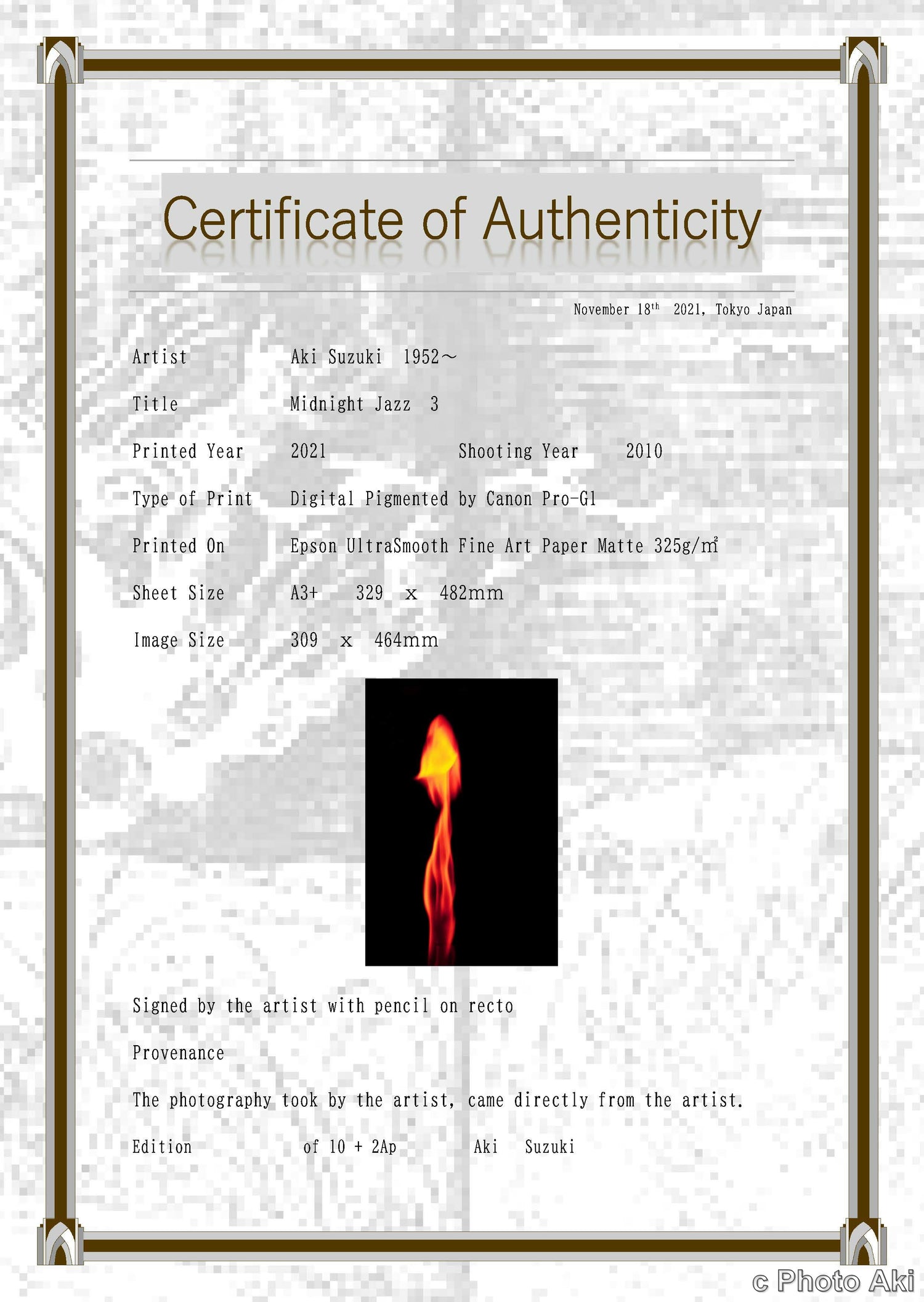 • 大きなサイズ:                           A3+(ノビ)サイズ=329x483mm(13”x19”)の紙にイメージサイズ309x465mmの家庭やオフイス、店舗用としてはかなり大きな写真です。作品のサイズを決めるのは悩ましいものです。出来るだけ大きい方がインパクトもあってアートとしては望ましいことが多いのですが、AkiFotoではこのサイズを採用しました。なぜなら、作家が自分自身で丁寧にプリント出来る最大サイズだからです。また作品にばらつきが出たり、万が一ミスを犯してとしても気にとめずに破棄できるのも重要な点です。
