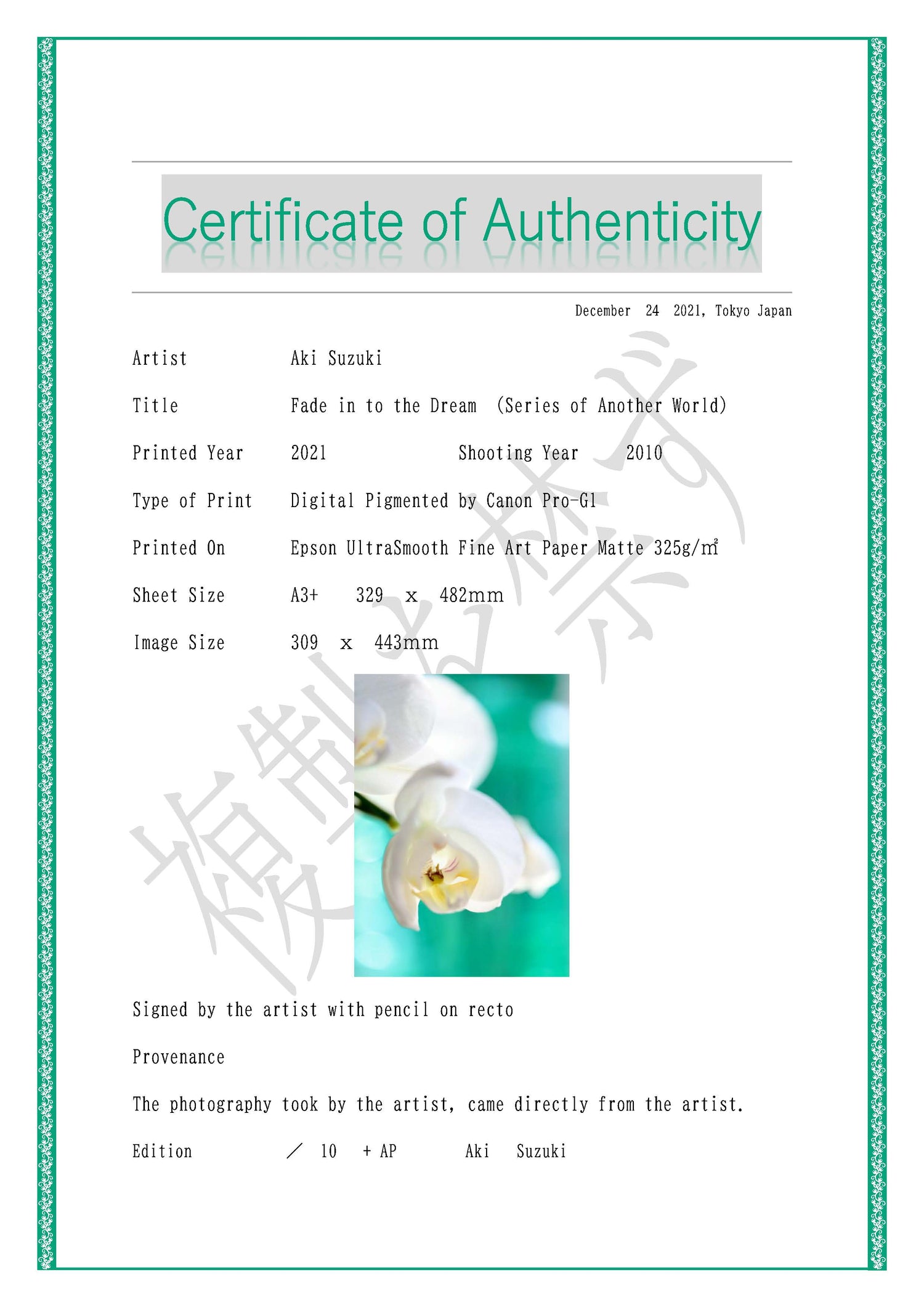 この作品の見せ所は何といっても他に類を見ない強烈なインパクトこのバックのグリーンだが、編集ソフトなどで加工していない実際のオリジナルの色だ。なので非日常を表現しつつも自然な風合いで飽きが来ない。