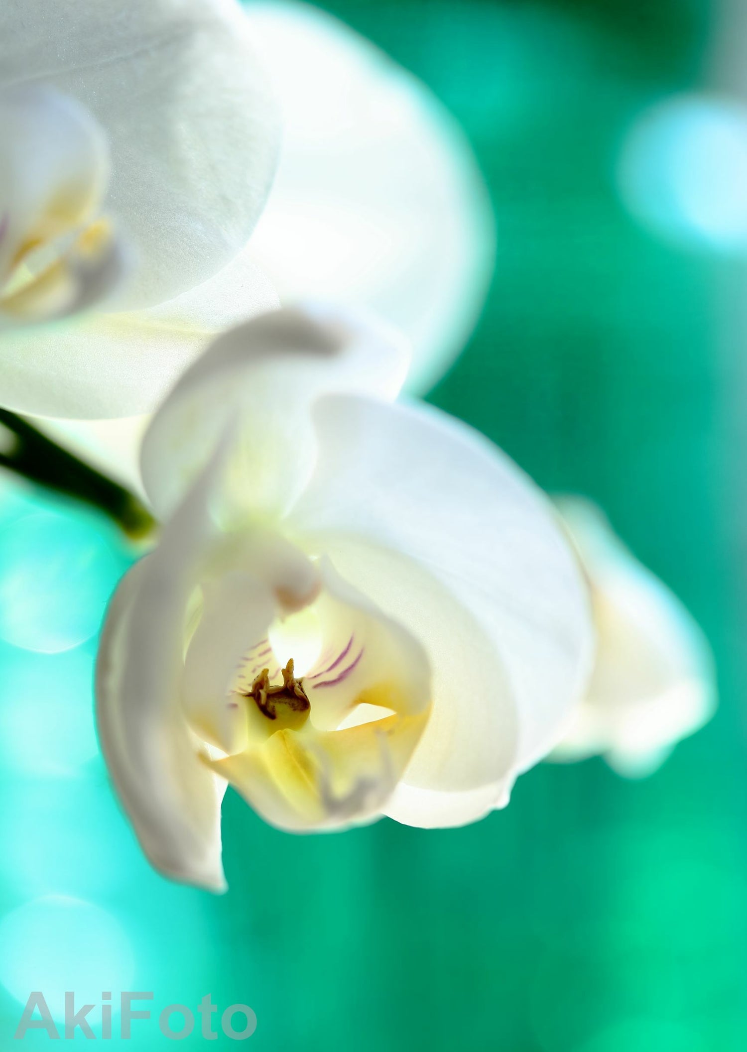 純白の胡蝶蘭の花は一つだけをよく見ると、和装白無垢の花嫁を連想する。微妙にボケたしかしビビットなコバルトグリーンがこの白い花をより一層清楚にひきたてている。この写真の主役は勿論胡蝶蘭なのだが、バックグラウンドも負けていない。とはいうものの互いに喧嘩せずに引き立てあっている。